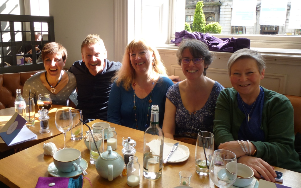 From L-R: Me, Stephen Watt, Jackie Baldwin, Lesley Kelly, Shelley DayWe met up at All Bar One at lunchtime. It was fantastic to catch up with everyone's news - where everyone was with writing, how they were getting on with their agent or publisher, discussing literary festivals etc. as well as hearing about life in general. There was a fabulous moment when Stephen was in the middle of telling us about how he had proposed to his fiancée and right at the crucial part, the waiter came in to take our order. I felt so sorry for the waiter because we were all desperate to hear the finale of Stephen's tale and chased the poor man away. He obviously forgave us though as he took the picture above for us.