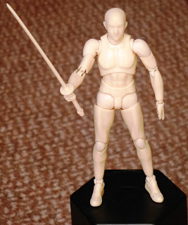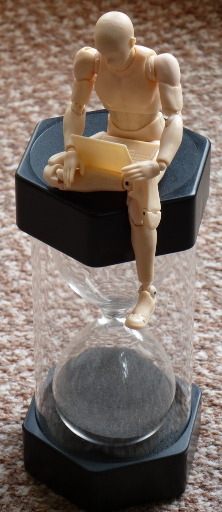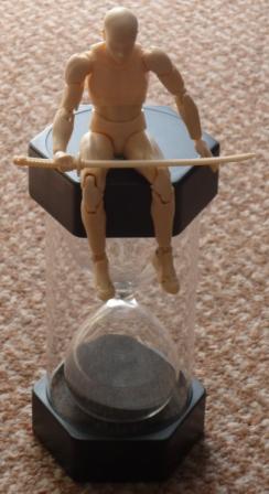 He's like the old wooden artists' models, except he's got more joints and can be posed in many more ways than they ever could be. As you can see in the picture, he comes with accessories too. It's an eclectic selection of things... a laptop, two mobile phones, a pen/pencil, a pad, a sword and a gun. He's 'working' on the laptop in the picture (which was taken a few weeks ago), but at the moment, he's sitting on the sand timer on my desk holding a sword across his lap.
