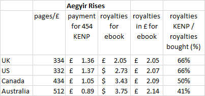 The final column looks better, right? But compare how much I get paid if someone in Australia reads the whole of the box-set in comparison with someone buying "Aegyir Rises"... £3.14 for 1606 pages read (three decent-sized books) compared to £2.14 for just the first book. The only reason the percentages in the final column look better is because there is a price-cap on the box-set in Canada and Australia. You can't charge more than $9.99 for an ebook in Canada or $11.99 in Australia. Since individual books are priced $4.99 and $5.99, you essentially get a book for free by buying the box-set there.