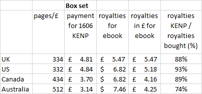 Amazon tells me "Aegyir Rises" is 454 KENP (Kindle pages) and the box-set is 1606 KENP. If I look at a month where I have good data for those four countries, I can calculate how many pages need to be read to earn me a pound in each country. From that, I can calculate how much I would earn for 454 pages, and 1606 pages. I can also compare the royalties generated by reading the book in comparison with buying the book.
