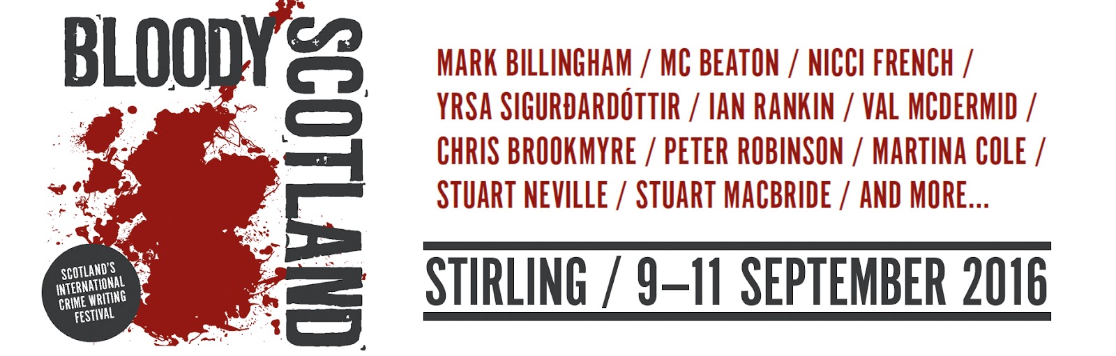 Image from Bloody Scotland site: https://www.bloodyscotland.com/The Bloody Scotland Festival is Scotland's International Crime Writing Festival. It's in its 5th year and this year will be held in various venues across Stirling, from 9-11th September. Some of the best-loved names in crime writing will be there, such as Chris Brookmyre, Stuart Neville, Peter Robinson, Alex Gray, Val McDermid, Lin Anderson, Mark Billingham and many, many more...