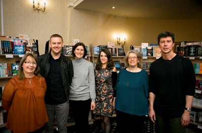 Hubby and I arrived in Stirling for lunch, after which I contacted Gordon Brown, one of the organisers, to say I was there and to ask what time I should register. He texted me back, telling me to go to the Albert Halls for ~4pm and we could sort out registration later. As it turned out, he didn't need me to go to the Albert Halls at all (he thought I was going for a rehearsal, but I was due to rehearse on Saturday). However, it did mean that I got to meet some of the other Crime in the Spotlight authors and hear them read their extracts, which was excellent. Rehearsals over, we all toddled back to The Golden Lion to register and have this picture taken of us in the Waterstones book shop in the hotel:
