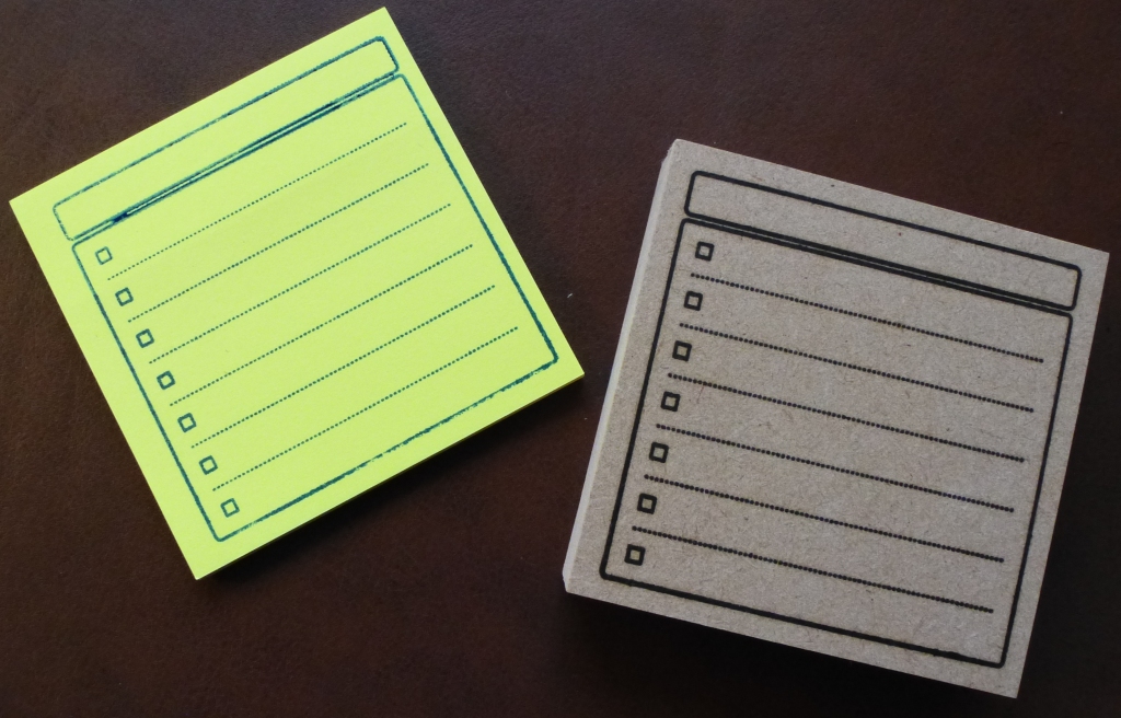 I love Post-It notes! I have drawers full of them. I use them pretty much daily. I have a rubber-stamp from Etsy (seller is CoolJapanStamp; see here for shop) of a To-Do checklist that fits perfectly on the 3" square Post-Its, giving me a portable To-Do list that can get moved from diary to desk to wherever.