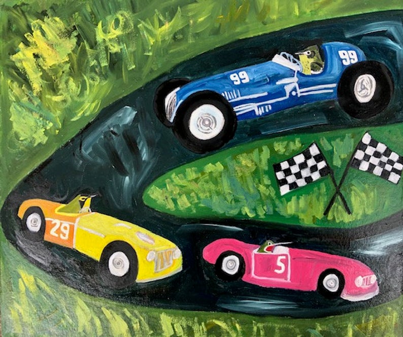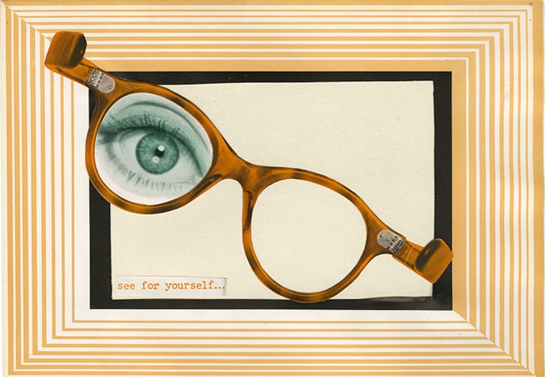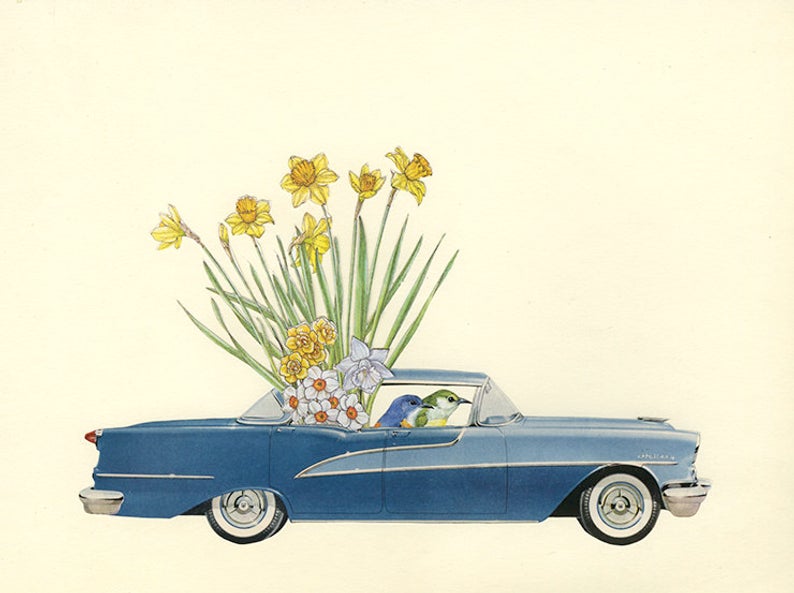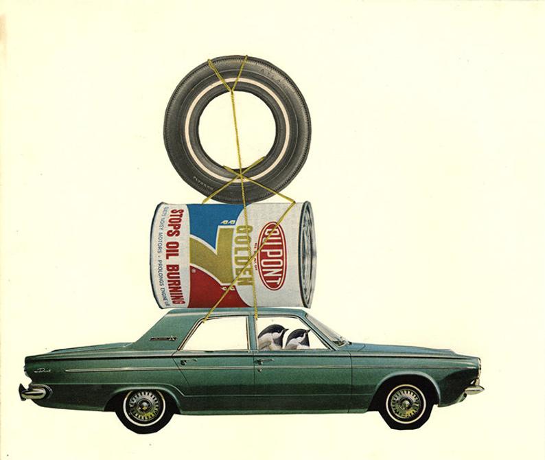 The Magliozzi brothers, always thrifty, clicking and clacking along in their Dodge Dart. collage on paper with stitching - a tribute to Tom & Ray