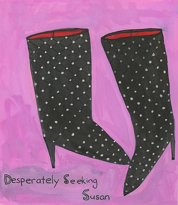 mixed media on paper - first in the series of Remembering the 80s When this movie came out, I just had to have these boots. Baker's Shoes had them - they were $149.00 - a lot of money in the 80s especially since my parents never simply "gave" me money. Every penny had to be earned - mowing the lawn, washing their cars, painting the house etc. I had these on layaway for the two months it took me to pay for them. About one month after I had them - Baker's put them on sale for $9.00. Madonna's had rhinestones I'm sure for the movie. The ones being sold were merely silver sequins. They were not comfortable. I had them well into the 90's until one of my cats threw up on them. There was no cleaning cat vomit off of fishnets and sequins.... I recently saw a pair on Ebay for $1,000. A priceless memory.