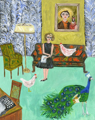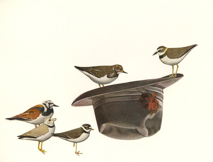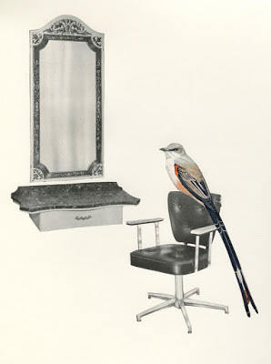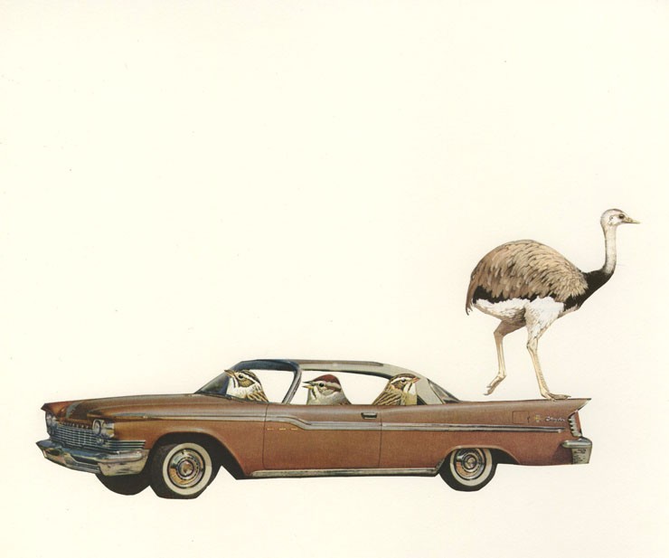 Titmice tourists in Texas.collage on paper with stitching and paint