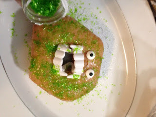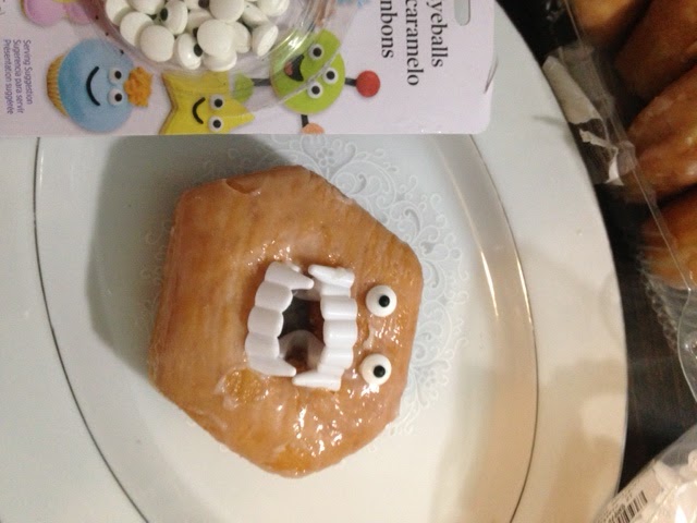 1. I gathered my materials. I picked up a dozen glazed donuts, a bag of plastic vampire fangs, and a package of candy eyes. For fun, I got some edible glitter. I originally thought I might make sparkly vampire donuts with silver glitter, but decided to get green so that the completed creatures would remind me more of ghouls.