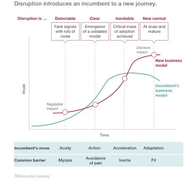 It goes on to describe in interesting detail the four stages of disruption from an incumbent’s perspective, the barriers to overcome, and the choices and responses needed at each stage.