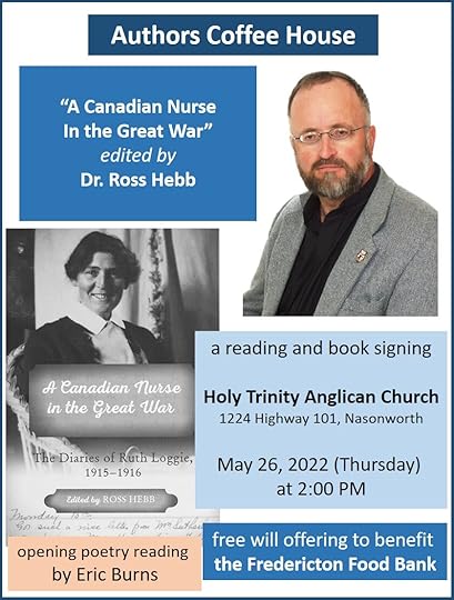 This month, on May 26 (Thursday) at 2:00, we will present Dr. Ross Hebb and his new book “A Canadian Nurse in the Great War.” The book features the diary entries of nurse Ruth Loggie in France in 1915 and 1916. The book is fascinating, in a very readable, well-annotated format, with lots of photos. Ruth was born in Burnt Church, New Brunswick in 1883.
