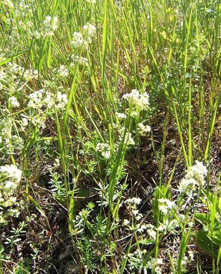 bedstraw (Gallium sp.) grows in mounds in the ditches, with leaves in whorls and white flowers …