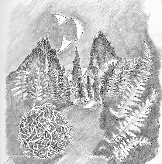 The cover painting took less than a day to paint. The colours are mellow and there is lots of room for the cover text. All of the Meniscus books have included the two Meniscus moons: Cardoth roe and Cardoth grill’en.