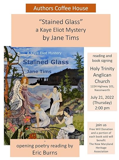 Mark Thursday July 21 in your calendar and join us for an author reading and lots of writerly discussion. Eric will perform some of his poetry and I will read from my new book in the Kaye Eliot Mystery Series. In the book, Kaye and her family travel the Noel Shore of Nova Scotia to track down a story told in windows of stained glass. ‘Stained Glass’ is the fourth in the Series. It would be great to see you there. Our efforts will benefit the New Maryland Heritage Association and the restoration of the 1864 Saint Mary the Virgin Anglican Church.