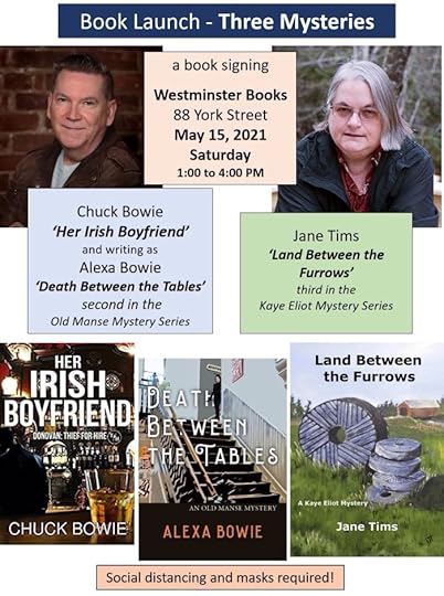 If you live in the Fredericton area, I will be at Westminster Books tomorrow, Saturday, from 1 to 4 to launch the next in the Kaye Eliot Mystery Series, Land Between the Furrows. I will be there with friend Chuck Bowie who is launching two books: Her Irish Boyfriend (in the Donovan, Thief for Hire Series) and, writing as Alexa Bowie, Death Between the Tables (in the Old Manse Mystery Series).