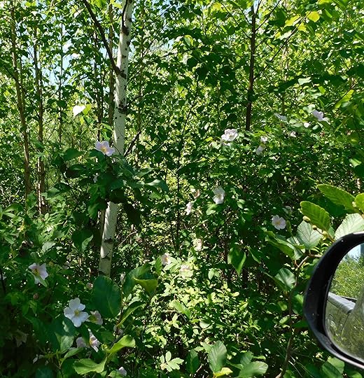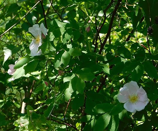 A few years ago, we trimmed out the bushes all along our cabin road, to prevent our truck from getting scratched. During the trimming, my husband saved a small prickly rose bush near to the road edge. Each spring we watch for the pale pink of its blooms. Each fall, we count the red rose hips as we drive by. This year, the bush has grown as tall as me! Today, it was covered with pale pink roses and smelled so sweet!