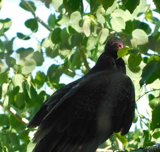 On our return from our cabin last week, I saw something dark among the leaves of an old birch tree. I put the truck in reverse, in time to see two turkey vultures take off. Their red featherless heads and white beaks were in full view. A third vulture was in the tree and we managed one camera shot before he spread his wings and flew after his companions. The photo shows his glossy feathers, his red head and his huge nostril. But his white beak is hidden behind a leaf!