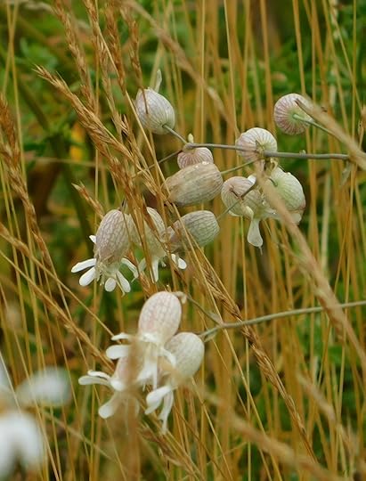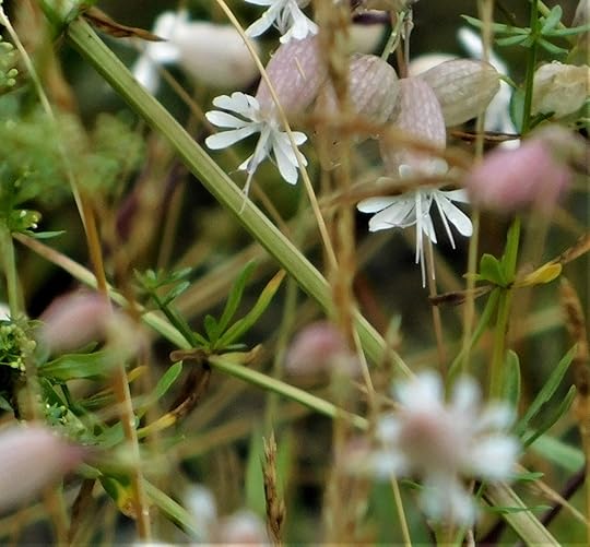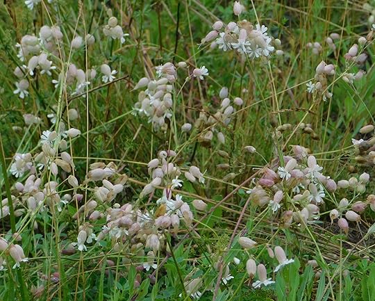 Bladderwort campion, Silene vulgaris, is a kind of faerie-tale flower, because of its bladders, small enough to be used by the faerie-folk to transport their drink. The alternate name ‘maidenstears,’ is also fanciful. The flowers are white, sticking above the top of a red-veined bladder. Reminds me of newly-bought vegetables poking above a grocery store paper bag.