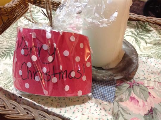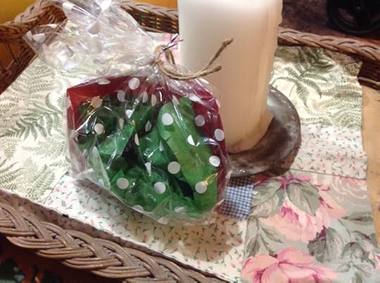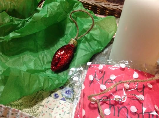 This afternoon I heard a tiny knock at the front door and arrived in time to see two children walking down our driveway. On the door handle I found a gift hanging! Very festive wrapping in a white dotted cellophane bag, a red card saying Merry Christmas and a gift wrapped in green tissue paper.