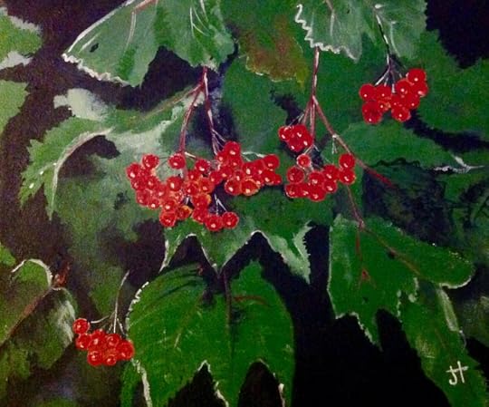Another painting to accompany my fall book and painting sale. These are high bush cranberries growing along the St. John River. The painting is done in acrylics, gallery edges, 12″ X 10″, Chromium Oxide Green, Paynes Grey, Titanium White, Cadmium Yellow Medium, Cadmium Red Medium and a touch of Burnt Sienna. The subject matter of high bush cranberries was a suggestion of one of my blogging friends!