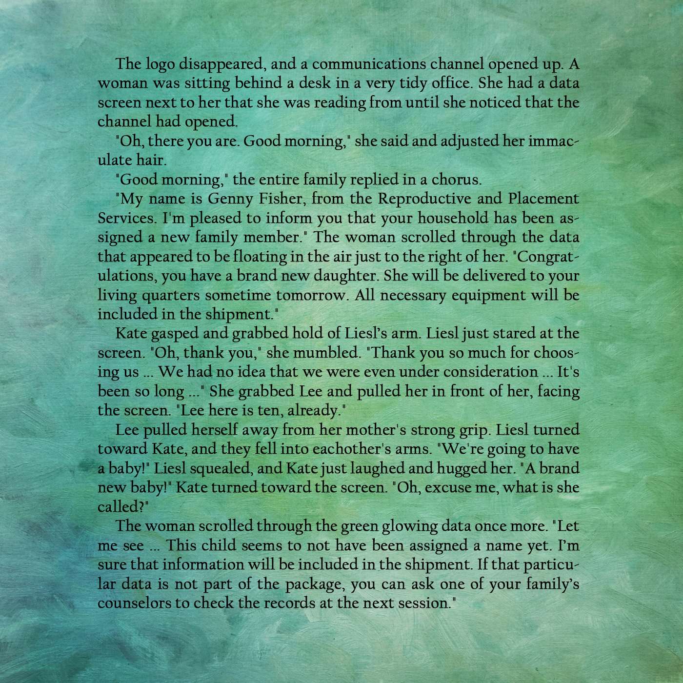 To keep you from getting bored, here is an excerpt from Outside, the Middle Grade Science fiction story that I'm working on right now: (Too small? Click on it!)