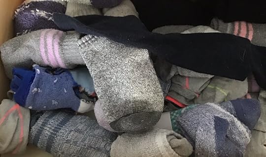Last week was parent-teacher meetings at English Rose’s high school, and one of her teachers has an office outside the gym and that ubiquitous lost and found box.