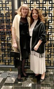 Here’s Jennifer Wilck and I in our party finery. For me that finery included a borrowed circa 1930s shawl and 1950s evening bag.