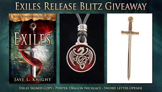 Share in the excitement of the release and enter to win a themed giveaway pack! Prizes include an autographed copy of Exiles, a pewter dragon necklace by treasurecast, and a sword letter opener! (Giveaway is open to US residents only. Cannot be shipped internationally.)