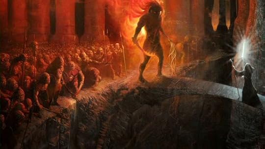 Suddenly Frodo saw before him a black chasm. At the end of the hall, the floor vanished and fell to an unknown depth. The outer door could only be reached by a slender bridge of stone, without kerb or rail, that spanned the chasm with one curving spring of fifty feet ...They could only pass across it single file. At the brink Gandalf halted and the others came up in a pack behind.Gandalf turned and confronted the Balrog, wielding the “Secret Fire,” which actually refers to the Spirit of the Creator God of Tolkien's mythos. This is "Secret Fire" is a reference to the Holy Spirit of the Lord of the Rings, which I have written more about here.