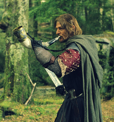 Boromir blowing the Horn of Gondor when surrounded by enemies at Amon Hen