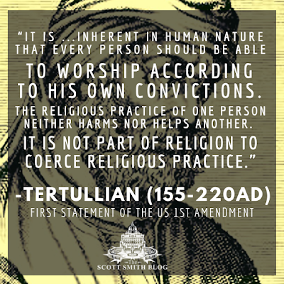 Do you know what this means? Tertullian wrote the first draft of the First Amendment and Thomas Jefferson knew it. Tertullian's quote contains the archae-Free Exercise Clause and the archae-Establishment Clause.