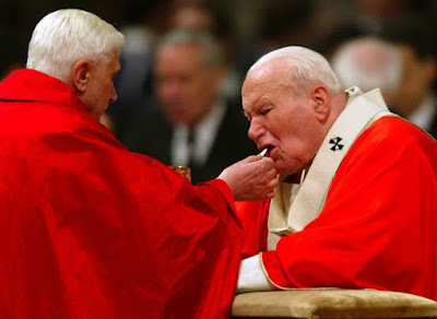 Pope St. John Paul II: "It is not permitted that the faithful should themselves pick up the consecrated bread and the sacred chalice, still less that they should hand them from one to another." (Inaestimabile Donum, April 17, 1980, sec. 9). Additional quotes in John Paul II section above.