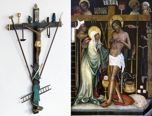 But iron shortened the Son of Man's days in a different way. Iron killed Jesus, as an instrument of His Crucifixion. The instruments of Jesus' Crucifixion, the Arma Christi (depicted below), were all made of iron: the hammer, the spear, the nails, and more: