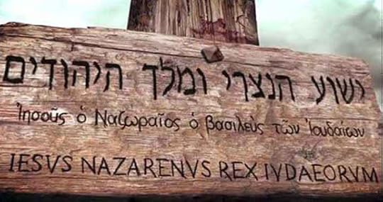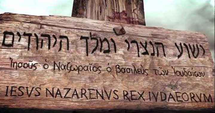 The last line above says "IESUS NAZARENUS REX IUDAEORUM", which translates as "Jesus of Nazareth, King of Judaeorum (or Judah)".