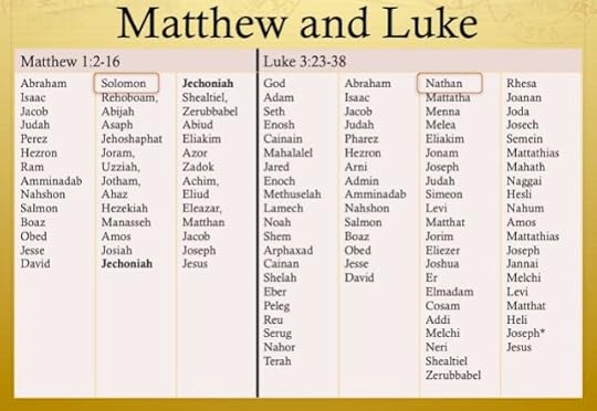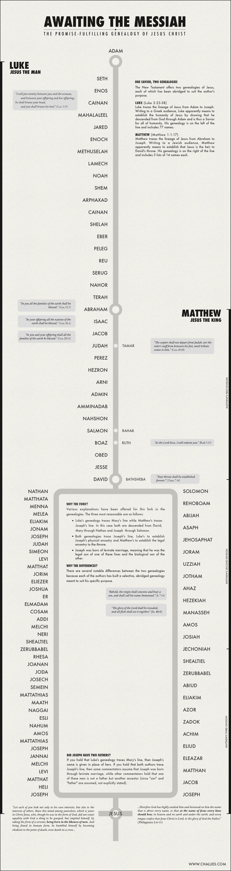 Genealogy of Jesus Luke vs. MatthewIf you're a visual person like me, charts are helpful. Here are some side-by-side charts comparing the Genealogy of Jesus found in the Gospel of Luke versus the Gospel of Matthew. That's Luke 3:23-38 versus Matthew 1:1-17. Genealogy of Jesus ChartHere is a nice, smaller chart comparing the Genealogies of Jesus found at Luke 3:23-38 versus Matthew 1:1-17. There's a bigger and longer one below, as well.
