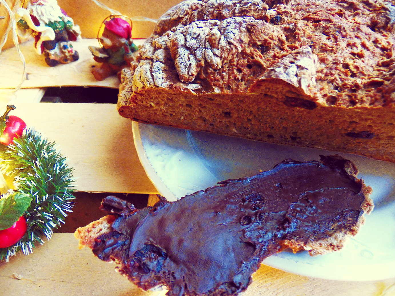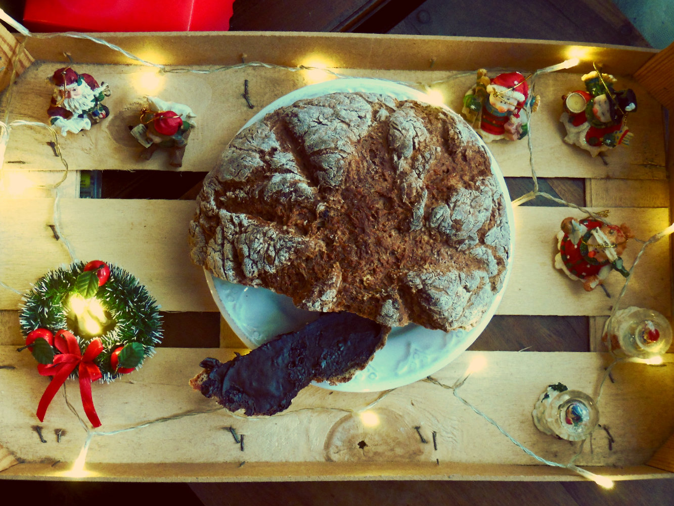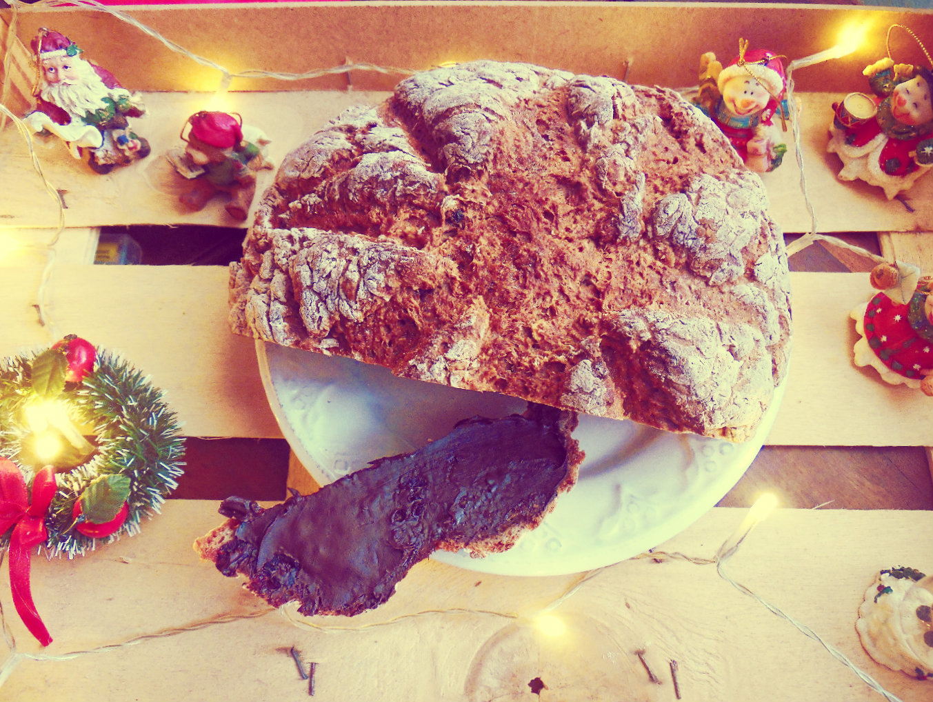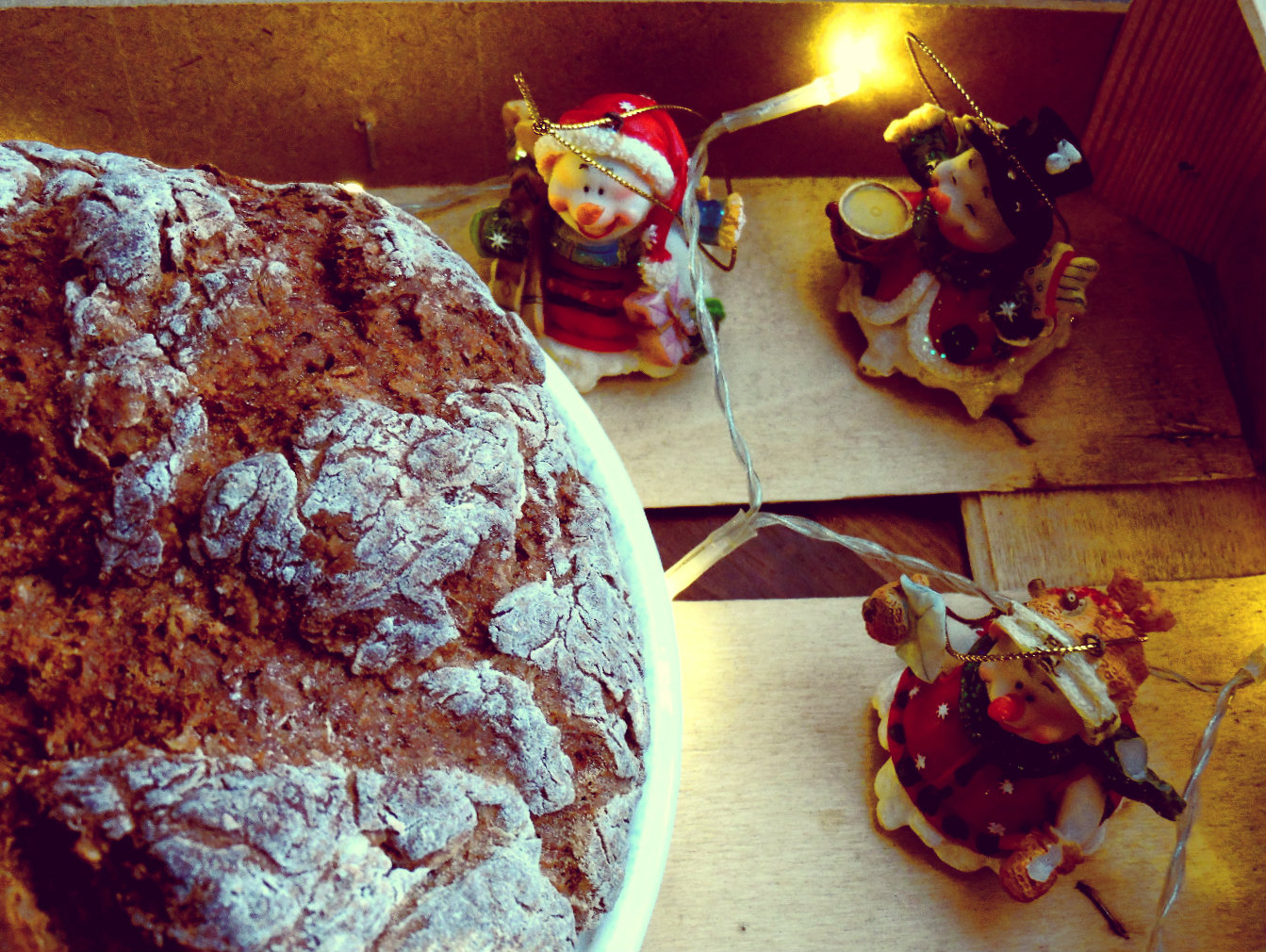 So here's my take on a Christmas Soda Bread:250 gr flour100 gr rye flour1 tbsp bran1/2 cup dried cranberries50 multigrain and oats mix - the one I use has dried fruits and nuts as well1tsp ground ginger1 tsp ground fennel seeds1 tsp ground all spice1 tsp cinammon1/2 tsp brown sugar1 tsp soda bicarbonate1 level tsp salt1 egg on the large side2 natural yogurts (125 gr each)2 tbsp cider vinegarPre-heat the oven at 190º. Place all the dry ingredients inside a large bowl and give it a stir with a fork, combining everything together. On a separate bowl whisk the egg and the yogurts together. With the fork stir the wet mix into the flour. Once it starts coming together, pour over a floured surface and use your lightly floured hands to bring the dough together. Shape it into a round ball and place over a lightly floured baking tray, dusting the top with more flour (use spelt, it will add a nutty crunch and flavour that is to die for!). Use your hands to slightly flatten the dough into a disk and with a knife score a star or a cross on top, then bake it in the center of the oven for 40 to 45 minutes. Try to resist the mouth watering scents coming from the kitchen, if you can, and let it rest for a few minutes before you tuck into it.