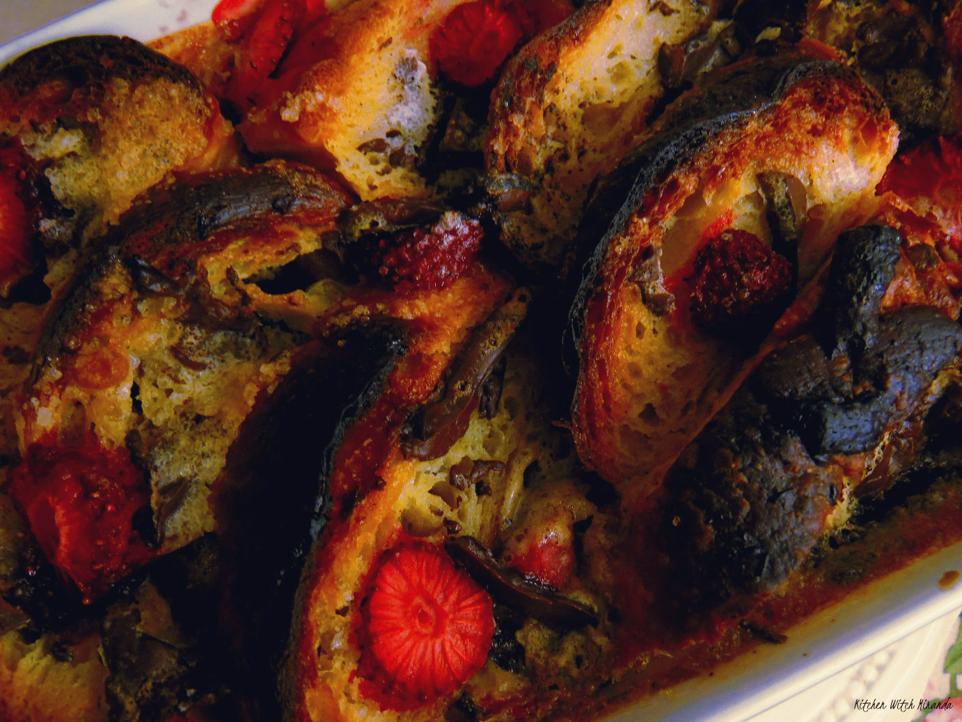 2 and a half croissants - either puff pastry (recipe here) or brioche (rye brioche here)2 tbsp strawberry jam (wild berries compote here)butter - it's your choice how much you use in the bread!half cup chopped strawberrieshalf a tablet dark chocolate, at least 70% cocoa 2 eggs1 tsp vanilla extracthalf a cup dark muscovado sugar2 cups of milkSpread the inside of the croissants with butter and jam, spread half of them on a baking tray. Scatter half the strawberries and half the chopped chocolate over it. Spread another layer of buttered and jam covered croissants and scatter the rest of the strawberries and the chocolate. Beat the eggs with the sugar, add the milk and the vanilla, pour over the croissants. Allow to sit and infuse for about half an hour then cook in a pre-heated oven at 180º until it's golden and bubbling away. Do not be me, and forget about it so when you take it out of the oven there's a healthy blush of nearly burnt croissant on top. We managed to just avoid that. Let it cool for a few minutes then serve and eat while you read one of my novels and unwind. Yes, it is the ultimate treat, I know