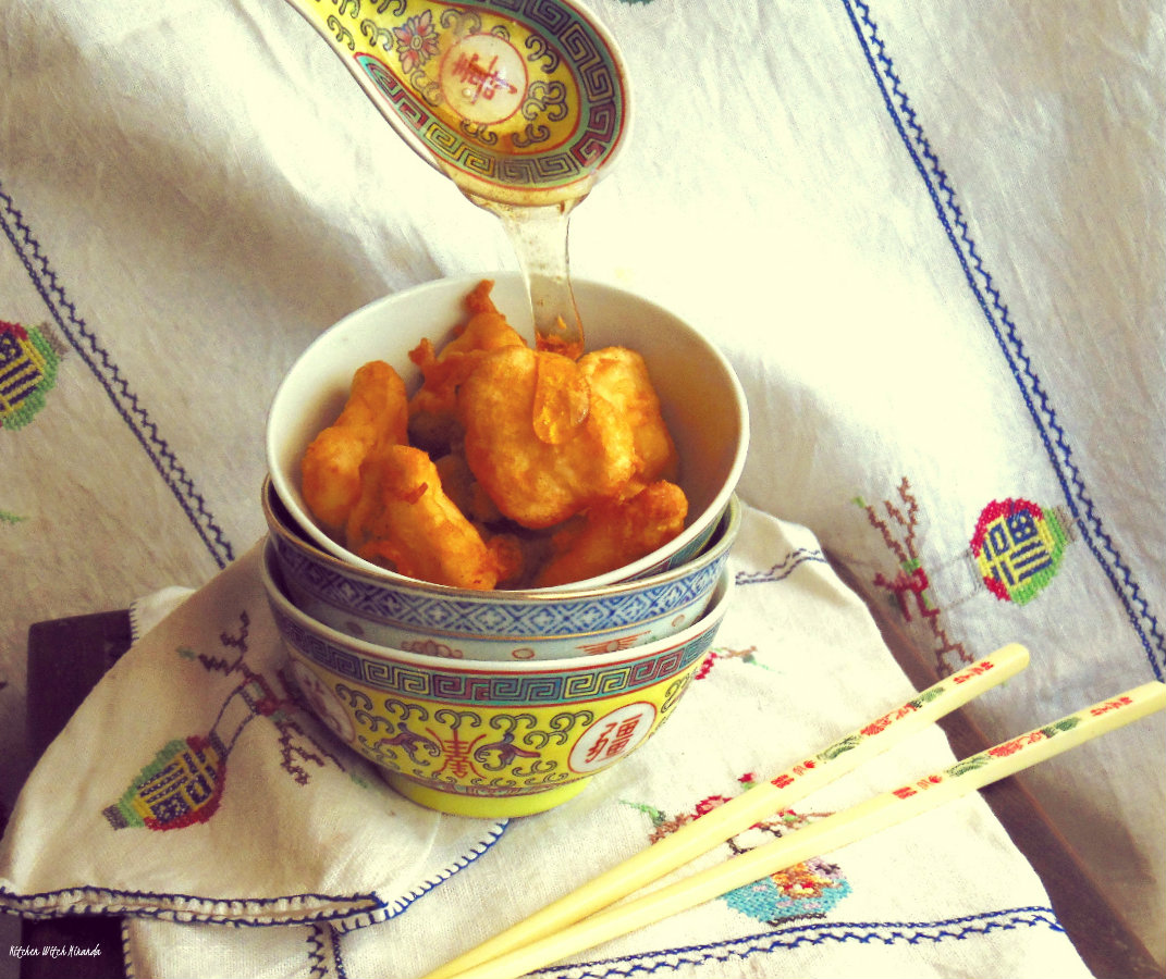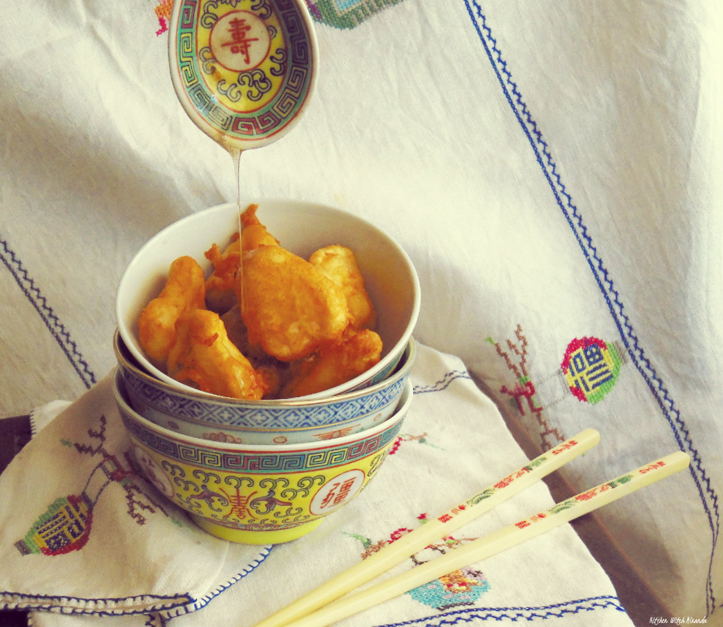 6 1/2 tbsp water10 tbsp sugar4 tbsp honey1/4 coffee spoon vinegarHeat up a pan with vegetable oil. Cut, peel and slice the pineapple into small chunks. Mix all the ingredients for the batter, and dunk the pineapple in it. Fry it in the very hot oil until golden and crunchy. On a pan, bring the water to a boil, add the sugar, honey and vinegar, mixing well. Once it thickens, it's ready. Don't let it caramelize, it's supposed to be clear. Pour this syrup over the pineapple and enjoy!