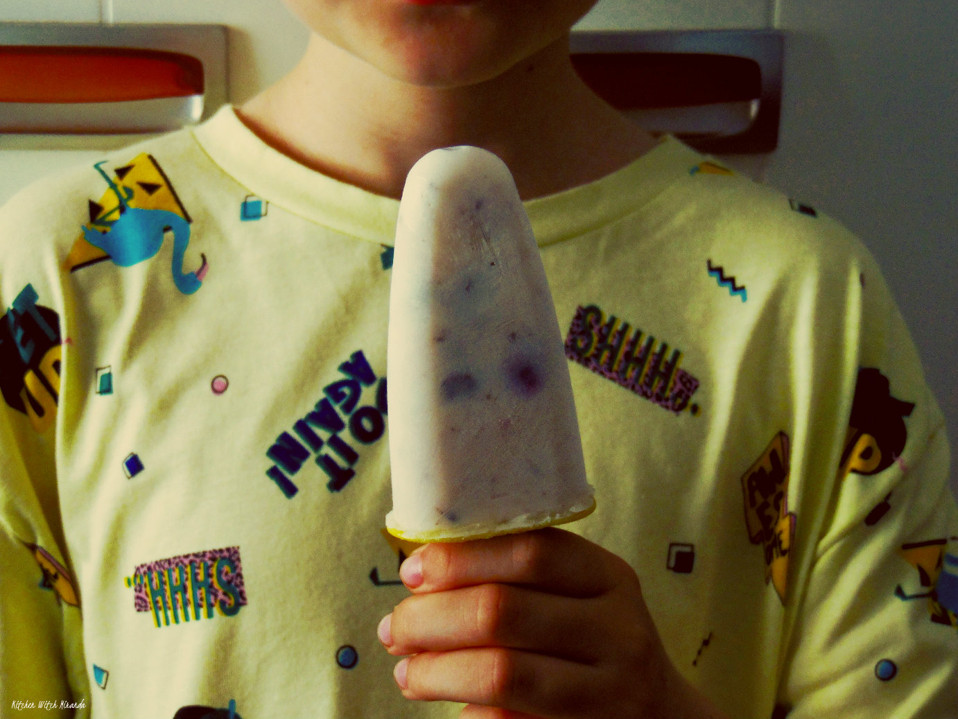 Like these easy and very yummy ones, that use only about three or four ingredients. They're quick to put together, you only have to wait for them to freeze, and are such a treat on a very hot day! I did use homemade yogurt, but hey, store bought will do the trick nicely, even yogurt that is vegan will do. So here's how:two natural yogurtsabout 50 grs dark chocolateone cup of frozen cassishoney, if you want to sweeten it - but you can use sugar too!On a bowl, whisk together the honey and yogurt as well as you can. Add the chocolate, coarsely chopped, and the cassis. Stir. Pour on the popsicle moulds and freeze. Eat. Repeat. Enjoy! Kiddo helped develop this recipe, so it was only fair I had him as a model, don't you think?