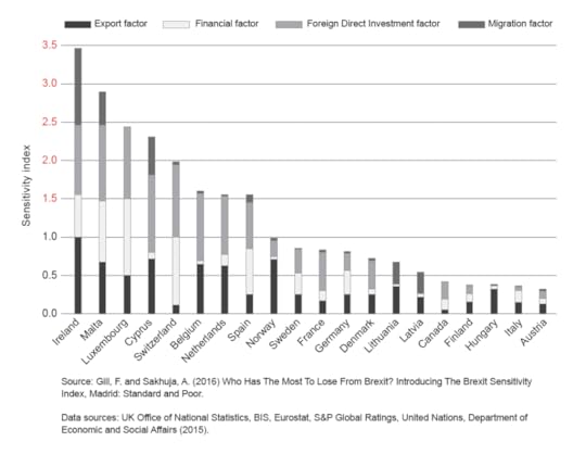 Figure 1 shows that the one non-UK European country most effected by a hard exit would be Ireland. However, Ireland is also benefitting from being an obvious destination of choice for companies that wish to relocate from the UK to an EU member state where the common everyday language is English. Dublin is currently experiencing an economic renaissance. The second most effected country is Malta, which is very small. The third most effected country is Luxembourg, which is very small. The fourth most effected country is Cyprus, which is very small. The fifth most effected country is Switzerland, which is not a member of the EU and which is not involved in the negotiations. None of these most effected countries are especially greatly affected economically. Furthermore, there is (and can be) no border on the Ireland of Ireland. English politicians have been very slow to understand that. Although not also understanding who economically unimportant the UK has become, in terms of what it can supply to the rest of the EU that is vital, could be seen as similarly stupid.