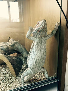 I did a bit of work for the day job. I also sorted out the banging noise from one of the bedrooms upstairs. The noise was caused by Cossie the bearded dragon trying to break her way out of her vivarium. Usually that means she's about to lay eggs. I brought her downstairs so I could sit on the sofa with her and stroke her back for a bit. Clearly I am a lizard whisperer because she calmed down. (This is her at a younger age, but you get the idea-up on back legs scratching at the glass.)