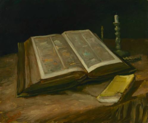 The Van Gogh painting that week was Still Life with Bible (above). The Van Gogh family Bible is open to Isaiah 53, which talks about salvation coming through a suffering servant. The book near the Bible (Vincent’s own copy of Emile Zola’s Joie de Vivre) is about a woman who was orphaned and undergoes adversity and harm–a modern-day suffering servant. While some see this painting as Van Gogh contrasting the heavy religion of his father with his own faith. Others (including the devotional writers) as Van Gogh pointing out two strains of the same idea: the raising up of a suffering servant.