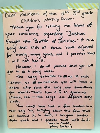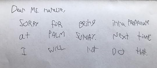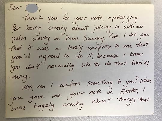 This letter was prompted by the parent due to said child’s behavior at being forced to participate in the parade of children and adults waving palm branches during the service. I’m going to guess it was an epic scowl; I was at the front of the parade, so I had no idea what was happening behind me. (I should note that we had 3 dozen or so kids in the parade that Sunday, a number of whom participated under duress, so I’m not singling out the lone scowler. I also have the child’s parent’s permission to post this.)