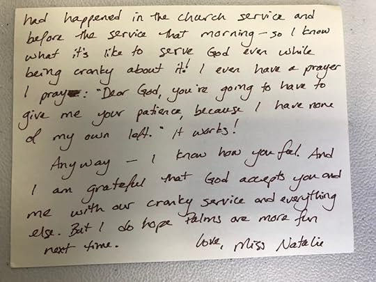 There’s a children’s song that I have a hate-tolerate relationship with, “God loves a cheerful giver, give it all you’ve got, He loves to hear you laughing when you’re in an awkward spot.” I was not cheerfully giving or serving, and all through the service, I could not laugh. It is entirely possible that I was muttering at points. And aggressively crossing and recrossing my legs.