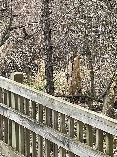 But more exciting than that: for the first time in the 30 years I’ve been walking there, I saw a pileated woodpecker! Those are the Woody Woodpecker-type birds, and they are huge. (It’s in the middle of the photo below, look for a reddish blur.) I was thrilled.