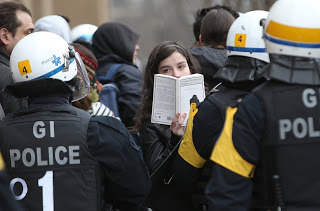 Mes pas ont croisé les leurs cet après-midi, angle Maisonneuve et Saint-Denis. Tandis qu'ils traversaient dans le calme et la bonne humeur sans tenir compte des feux rouges, la circulation bloquée remontait jusqu'à Sherbrooke et klaxonnait de bon coeur, au rythme de Ce n'est qu'un début, continuons le combat! Jusqu'aux employés de la voirie, immobilisés dans leurs engins, qui reprirent spontanément le refrain. Par les fenêtres des véhicules, on voyait se brandir vers le ciel ici des poings, là des signes de victoire (et/ou de Peace & Love). Et c'était l'Halloween en mars.
