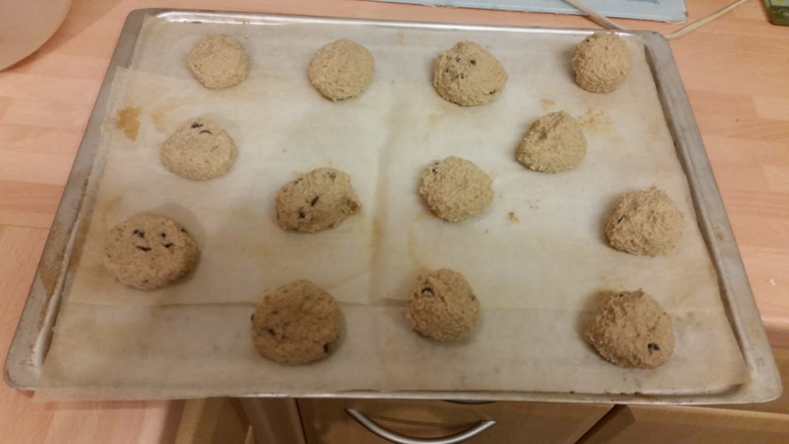 Add 75g Chocolate Chips and mix again, then separate into small balls and put onto a lined baking sheet. There are 13 there but you could easily make 15 or 16.