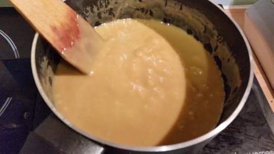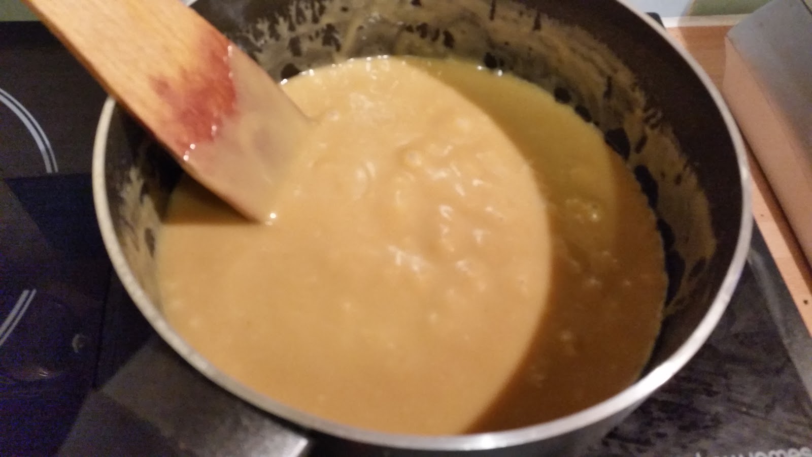 add a tin of Condensed Milk (397g) and simmer for about 8 minutes, I used my Induction hob set at 100°C and kept stirring. You will feel the mixture thicken.