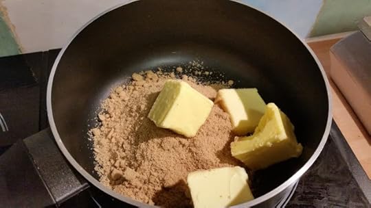 Next, the caramel, melt 150g butter and 150g light brown sugar in a pan,