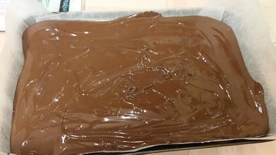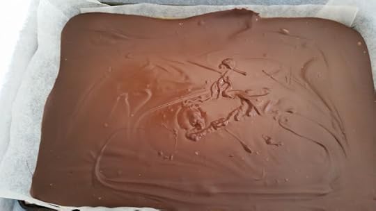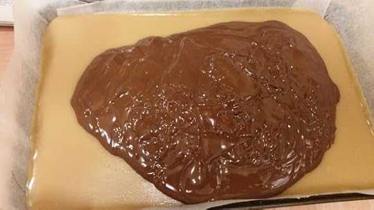When the top is set, melt 400g chocolate, I used 200g each of Plain and Milk and the microwave (people will tell you not to use a microwave but I like to live on the edge! Be careful though and just heat for 20 seconds at a time, stirring well before re-heating),