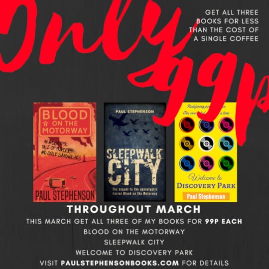 So, for the whole month, I am lowering the price of ALL THREE of my books to 99p, or 99c if you’re living under a fascist state. That’s right — Blood on the Motorway is only 99p on ebook. Sleepwalk City is only 99p on ebook. Welcome to Discovery Park is only… you get the idea.