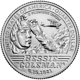 The coin itself is … OK. It shows Ms. Coleman reaching up to adjust her flight goggles, which is a good pose, but due to the limitations on the coin itself, her right arm and hand do not look clear, and I had to expand the image to figure out what was going on over there. Still, it is good take on the three-quarters view we've seen on other quarters. The plane in the background is, I believe, a Curtiss Jenny (Curtiss JN) which was used to train most of the US WWI pilots and was used in the post-war years by barnstormers and mail flyers, among others. Where the coin works best is in the "right stuff" style for the name (and when she got her pilot's license). OK, but a bit muddled and lumpy in her flight suit.